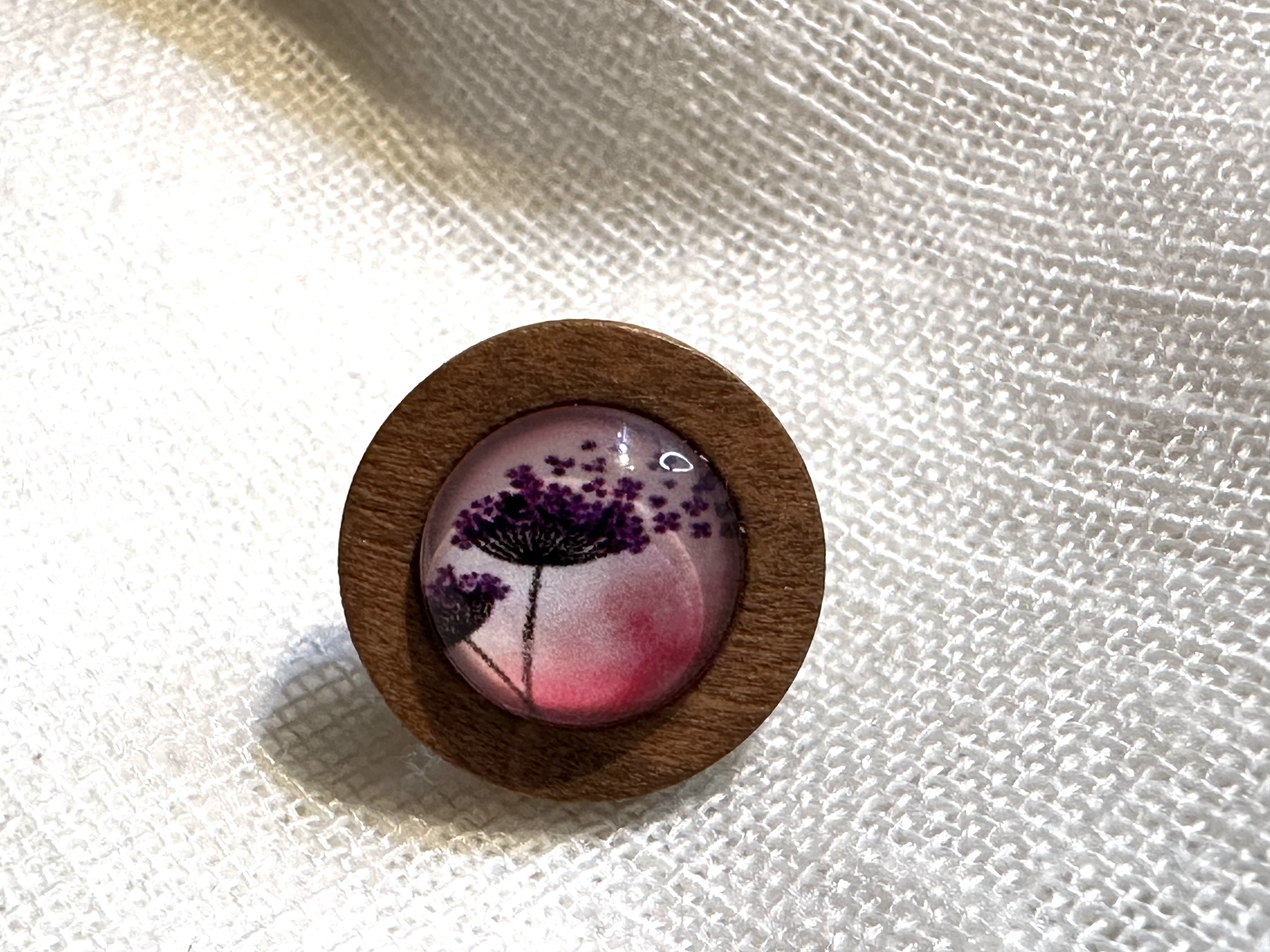 Minimalistinė sagė (medinis pagrindas, stiklinės detalės, užsegimas - vinukas, skersmuo apie 2 cm.)